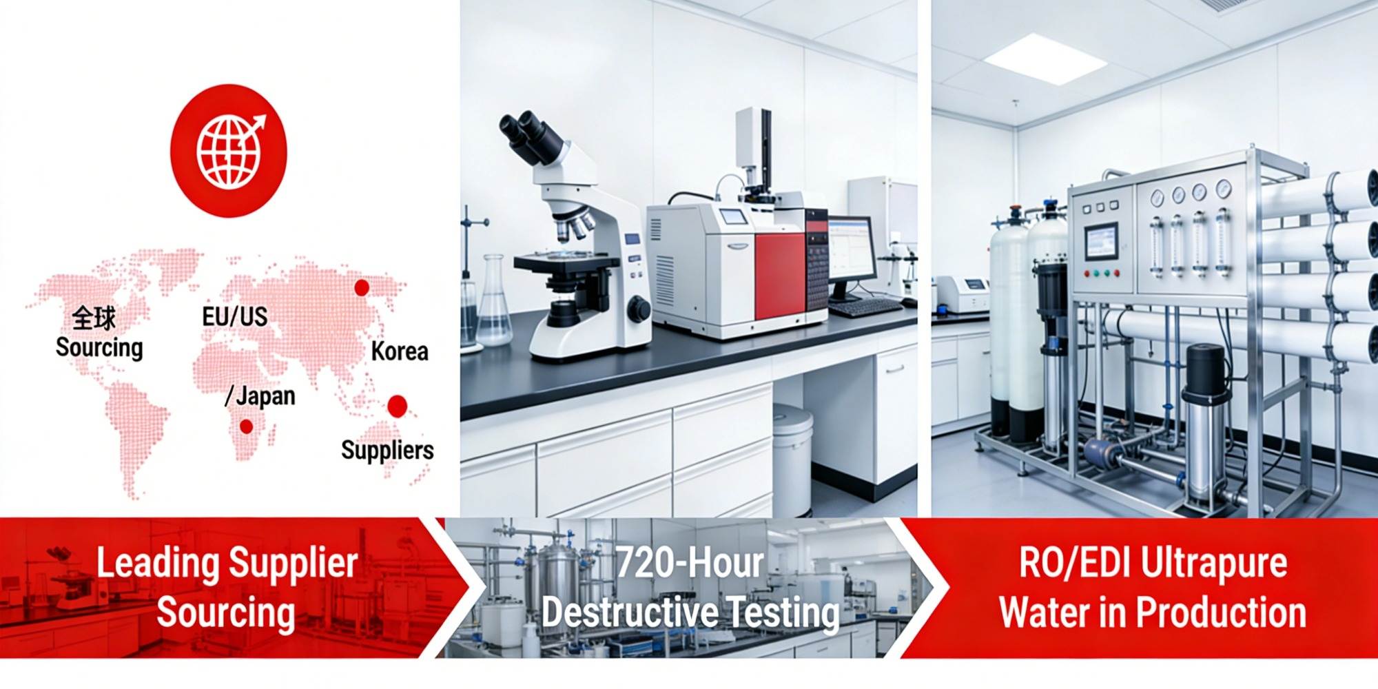 Durch die weltweite Beschaffung von Rohstoffen führender Lieferanten aus der EU, den USA, Japan und Korea, hauseigene Labore, die 720-stündige zerstörende Prüfungen durchführen, und die Verwendung von Reinstwasser aus Umkehrosmose und elektrolytischer Deionisierung während der gesamten Produktion gewährleisten wir die Qualität der Rohstoffe, die Produktsicherheit und die Stabilität der Rezeptur.