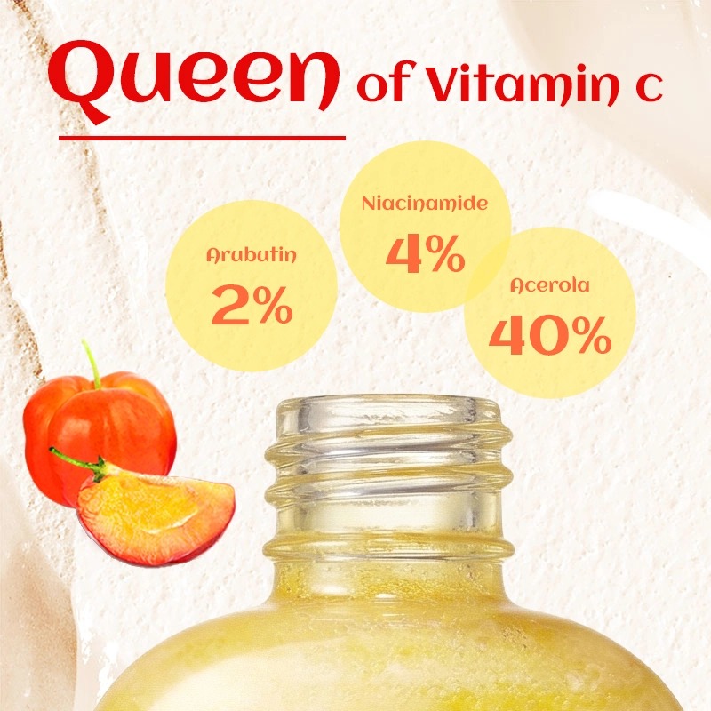⇒ Vitamin C (40% Acerolakirschenextrakt): Die Acerolakirsche, auch bekannt als die „Königin des Vitamin C“, liefert eine hochstabile, sanfte Form von Vitamin C, bietet einen starken antioxidativen Schutz, hellt den Hautton auf und unterstützt die Hautbarriere für langanhaltende Leuchtkraft.