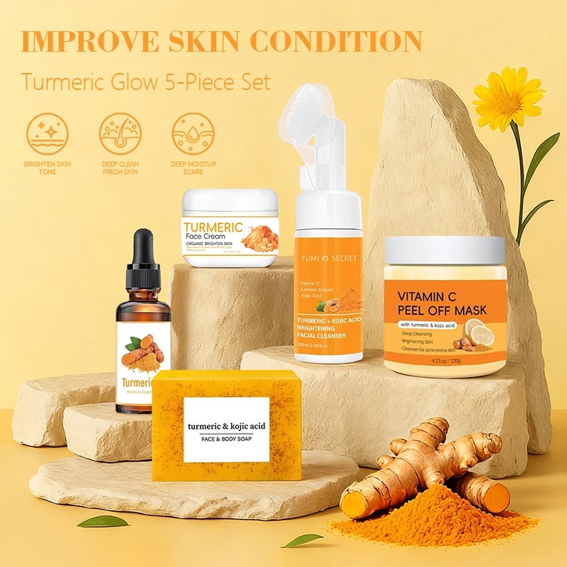 Dieses 5-teilige Kurkuma-Set bekämpft Aknenarben, dunkle Flecken, fahle Haut und große Poren und bietet eine komplette tägliche Pflegeroutine für sichtbare Hautverbesserung.
