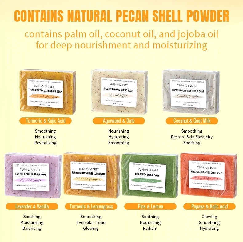 Enthält 7 natürliche Duftstoffe, darunter Kurkuma, Sandelholz, Kokosnuss, Lavendel und Papaya, für aufhellende, beruhigende und feuchtigkeitsspendende Wirkung.